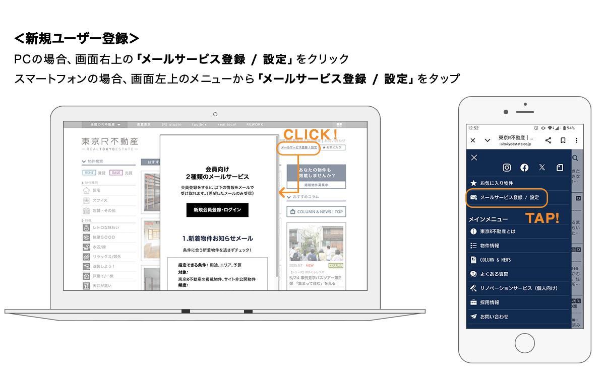 「スマートフォンで見たさっきの物件を、パソコンでもまた見たい」。そんなときは、「ユーザー登録」をしていただくと、他の環境に移っても、ログインすればお気に入り物件情報を引き継げます。